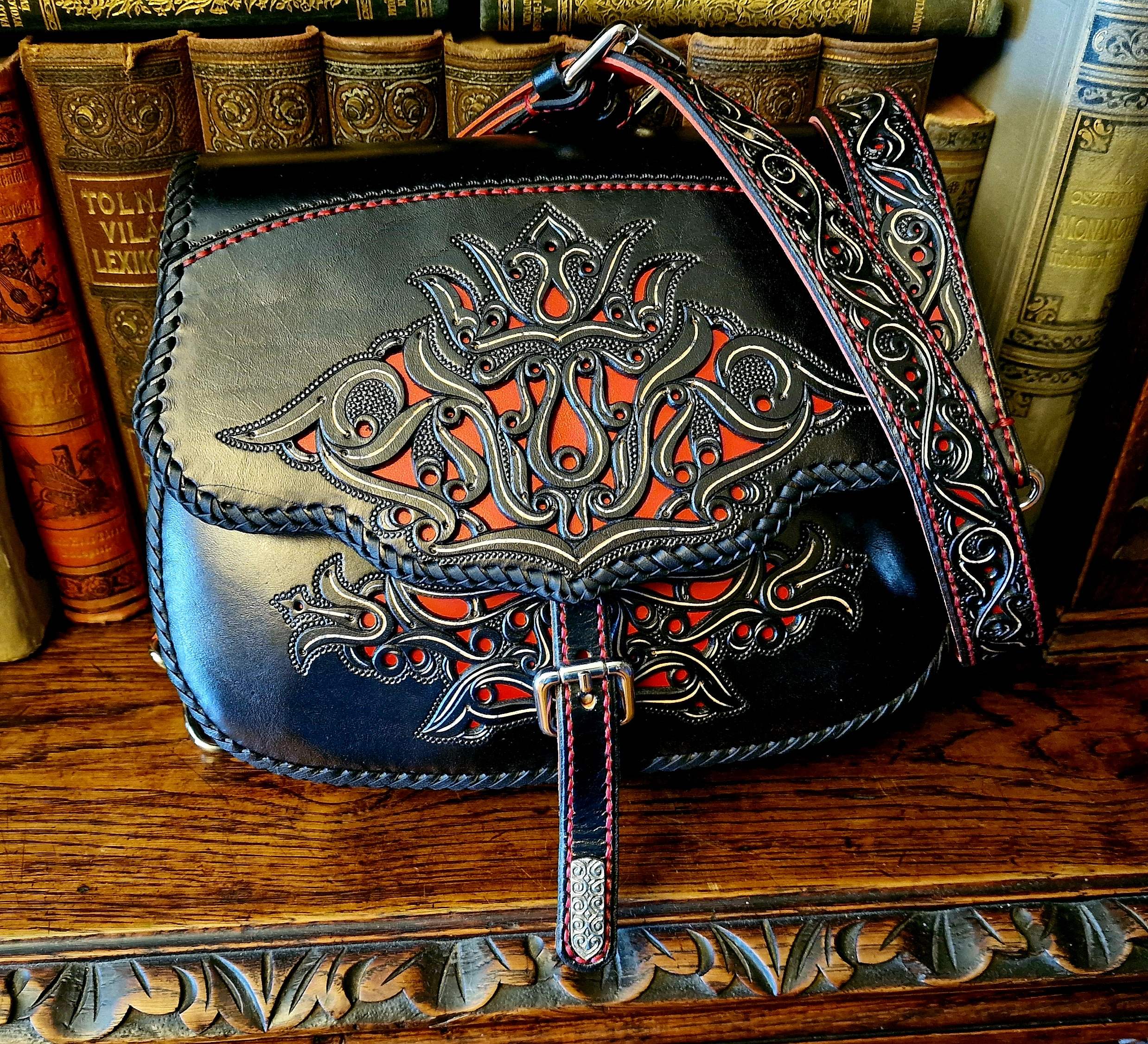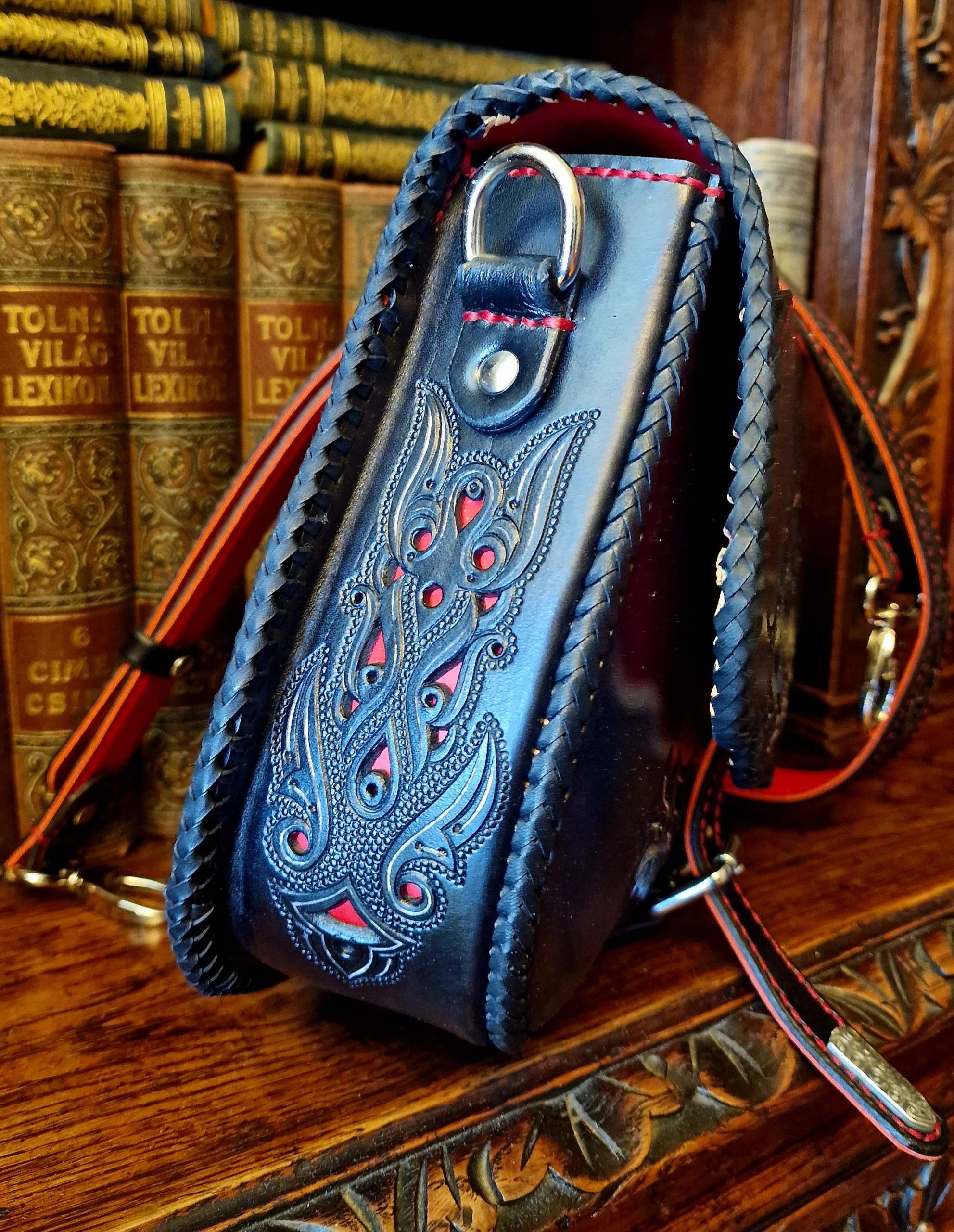 Richly decorated, colour inlay, ladies side bag. The piece is richly decorated on all sides, lined in cowhide and cowhide leather, with hand-stitched silver-plated stitching.