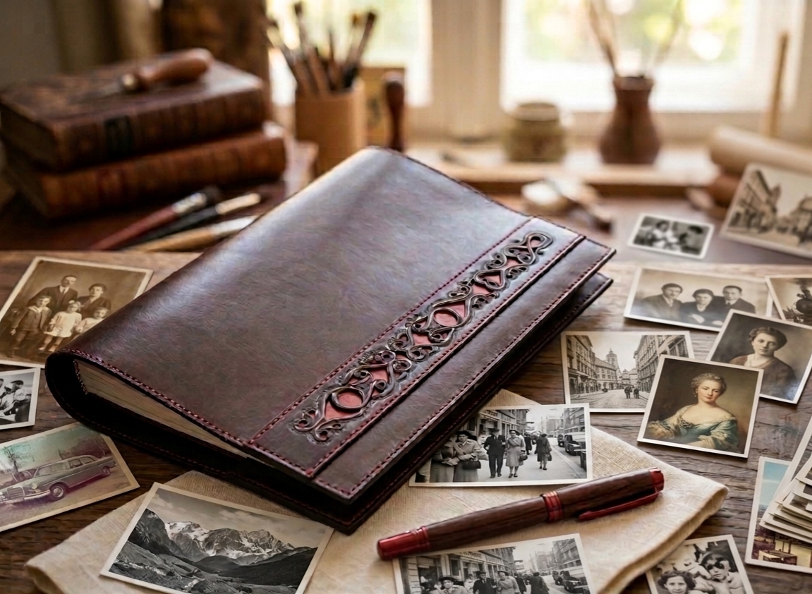 Custom patterned vegetable tanned cowhide leather photo album with double inside pockets, sewn edges and sheepskin lining!