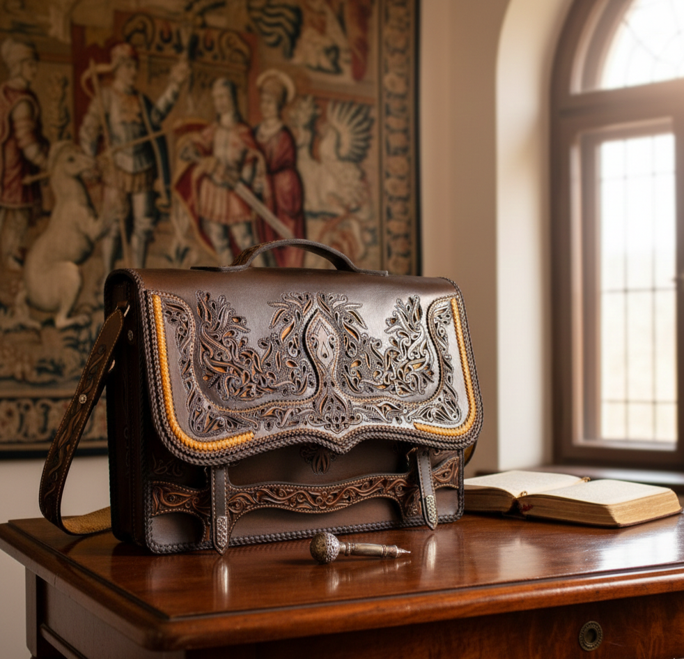 Richly decorated with engraved patterns, made of vegetable tanned cowhide, double compartment, 2 flap pockets, detachable shoulder strap, double handles, silver plated handles.