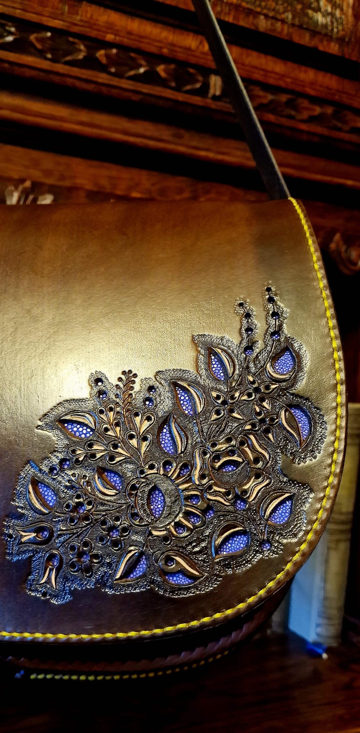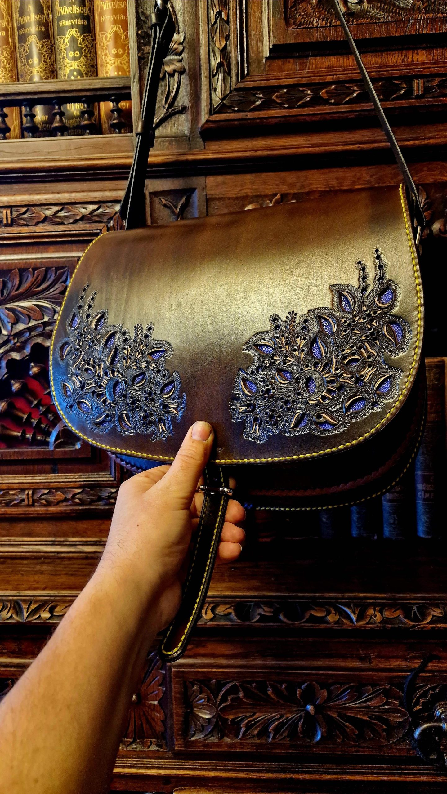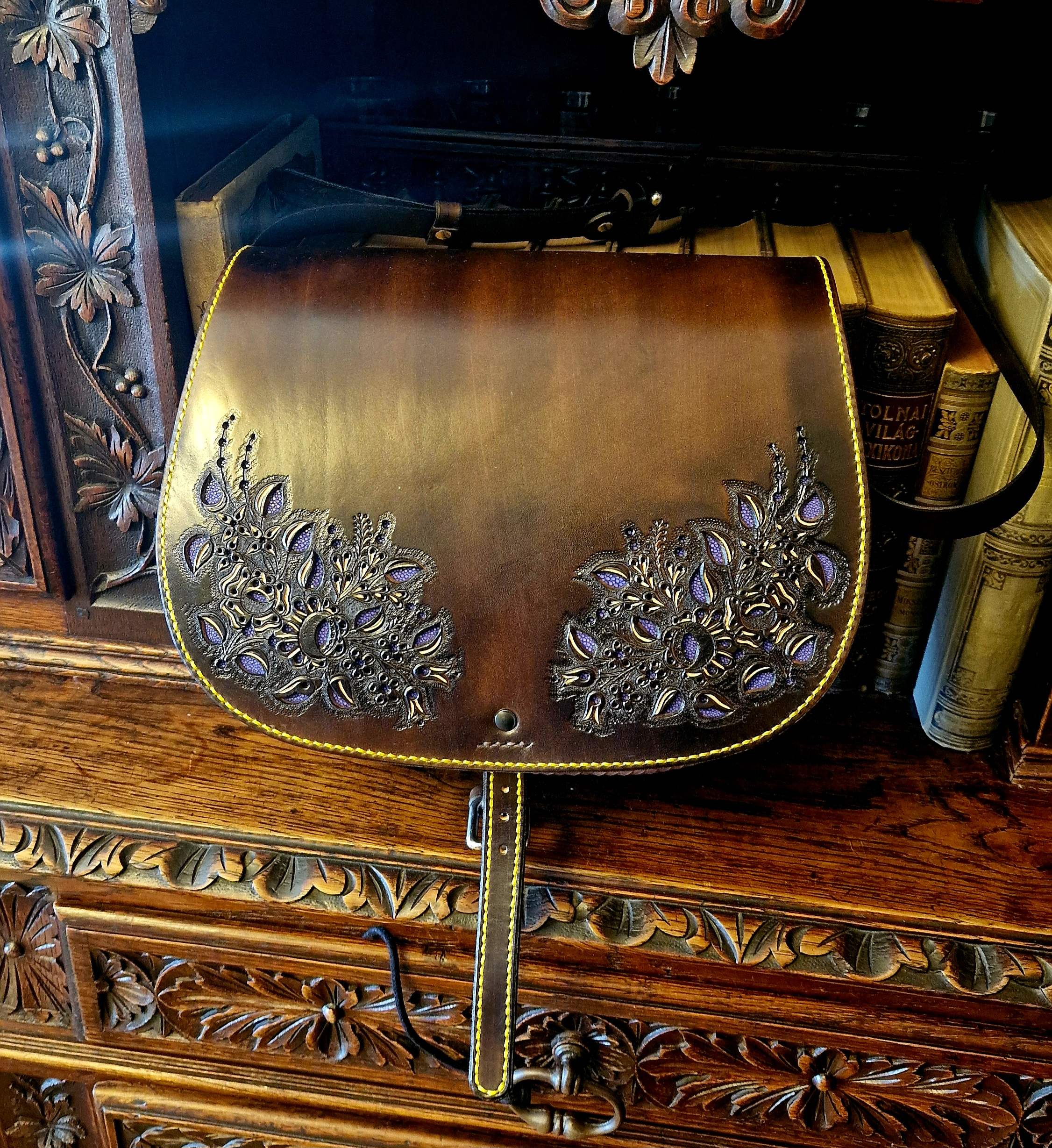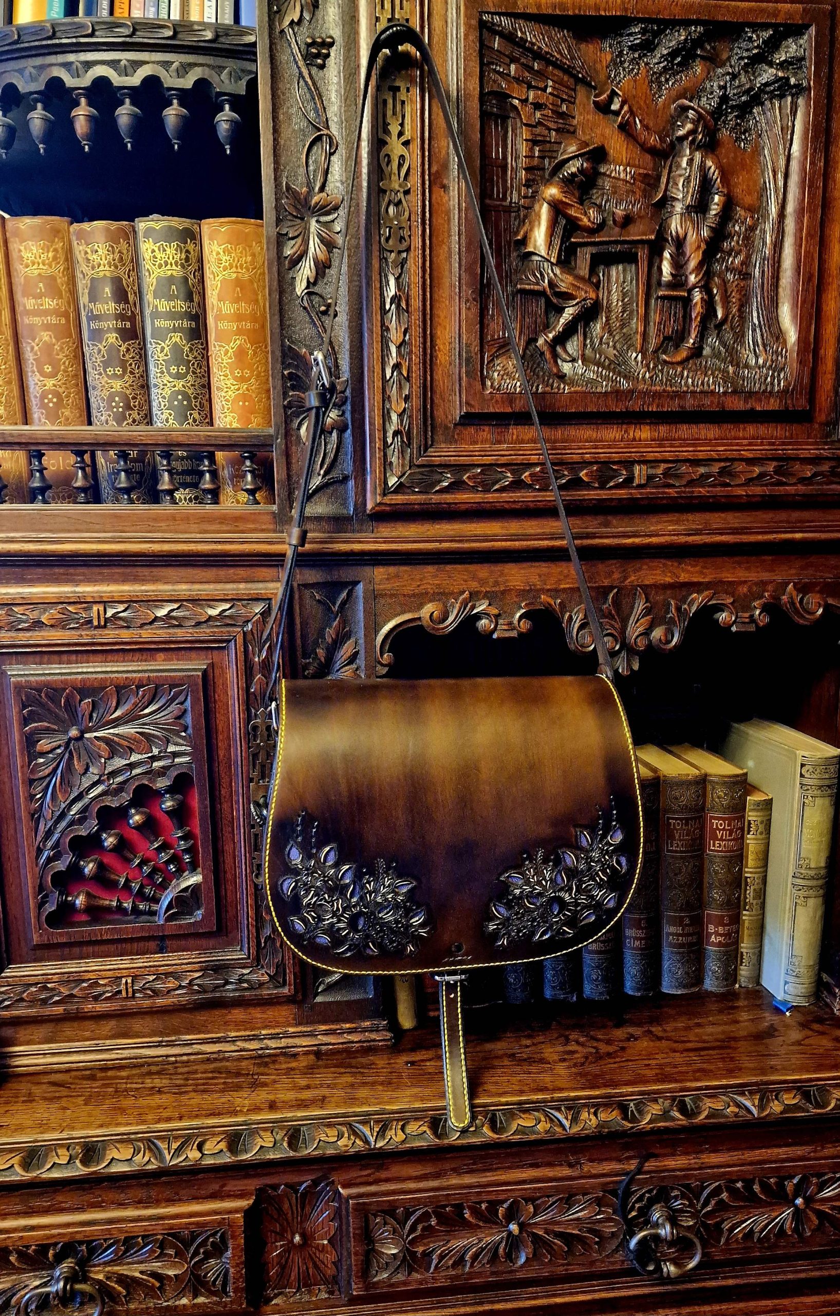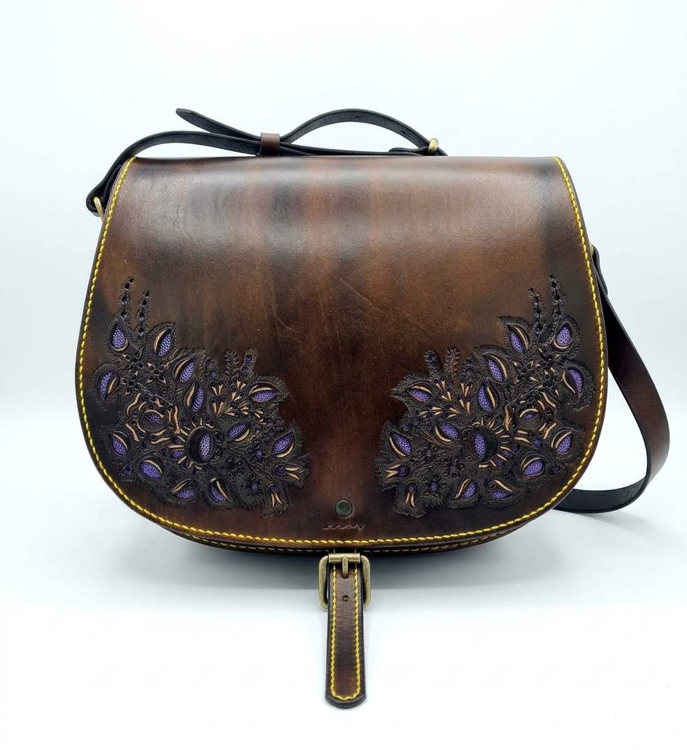 Exciting richly decorated 2 compartments, 2 flap pockets, laced edge, openwork, orange insert bag. Unique look, practical size and shape.