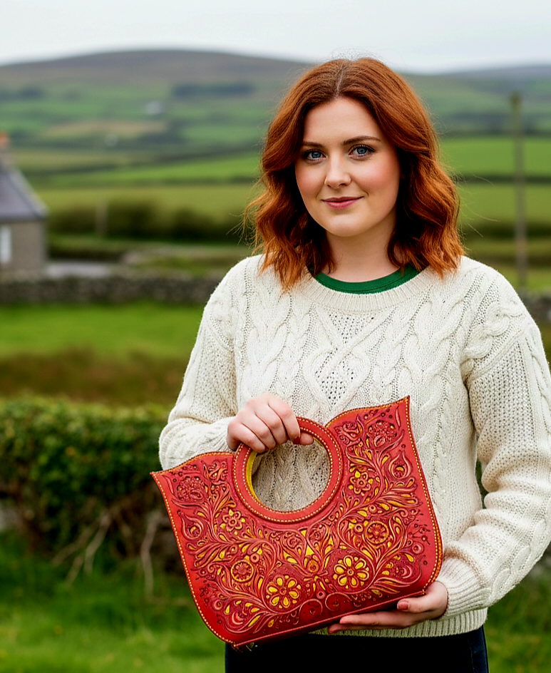 This very special bag, with double handles and a copper logo, has a richly engraved and openwork floral pattern all over the front. The inside has 1 large compartment and a flat pocket. All parts are made of cowhide and lined with cowhide and are entirely handmade.