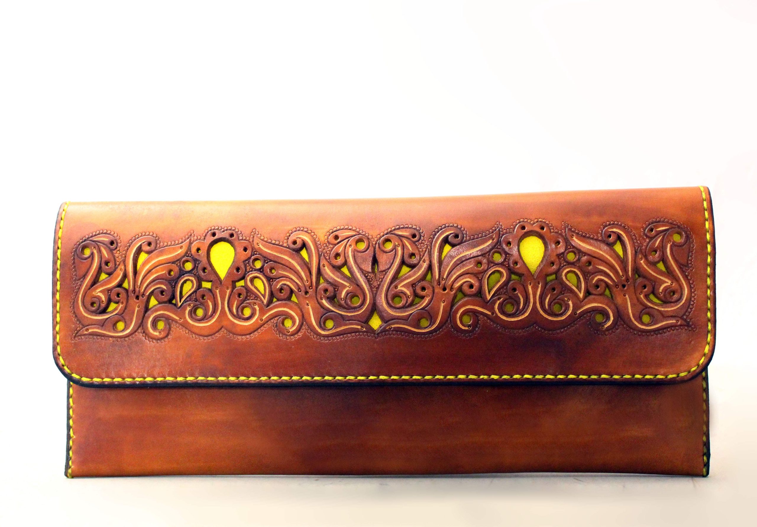 Madarakkal és növényi mintával díszített, marhabőrből készített női kis táska, dupla mágneses, fedeles  záródással.