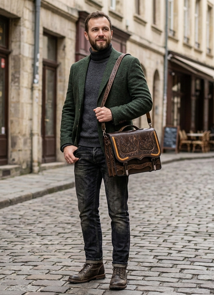 Vésett mintákkal gazdagon díszített, növényi cserzett marhabőrből készített, dupla rekeszes, 4 lapos zsebes, levehető vállpántos, dupla kézi fogós, ezüstözött veretekkel ellátott táska.