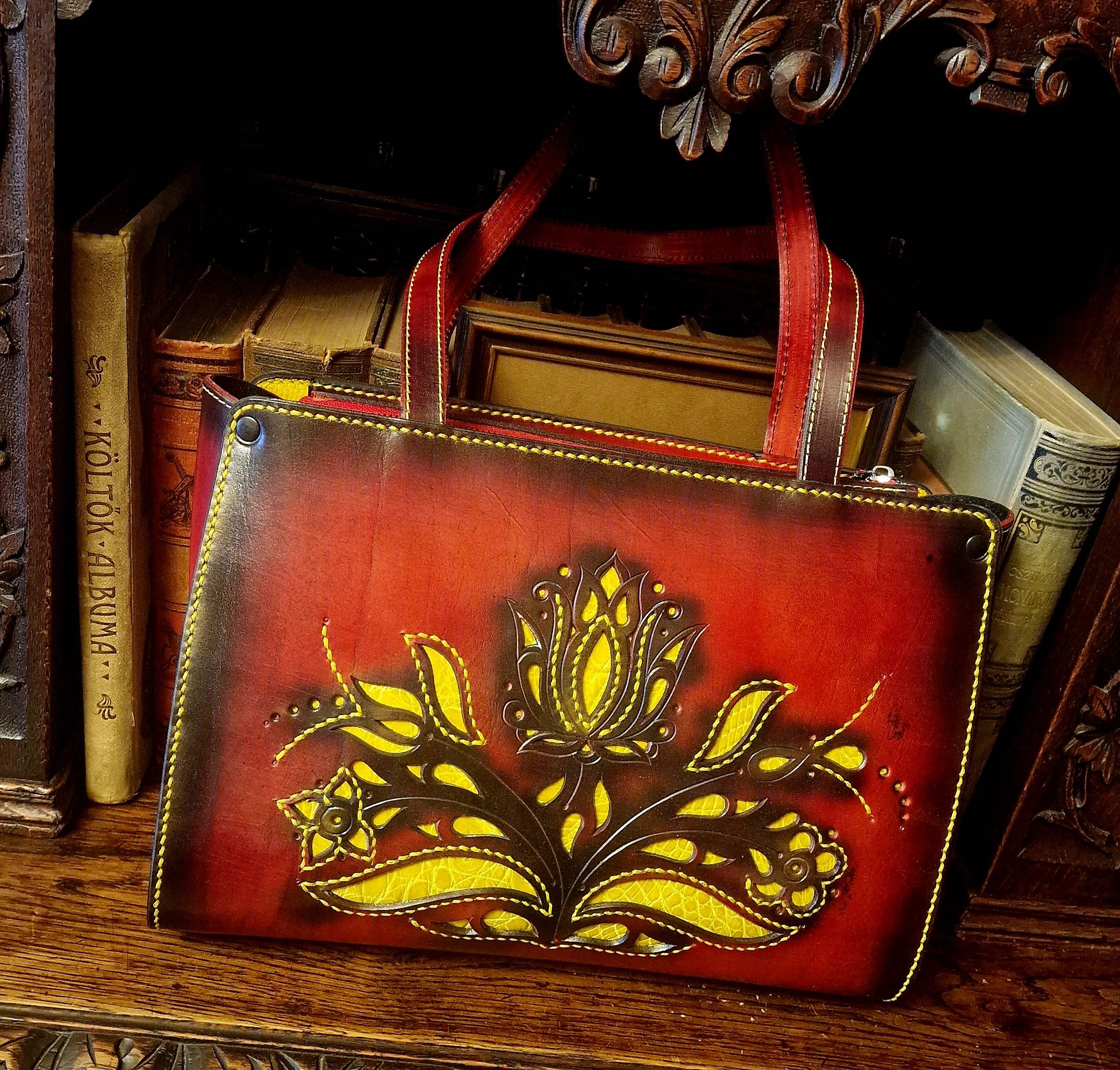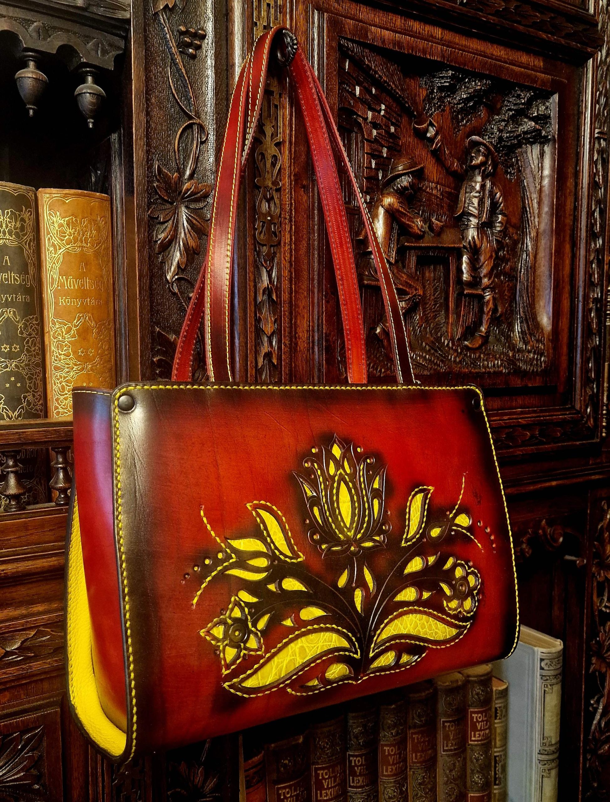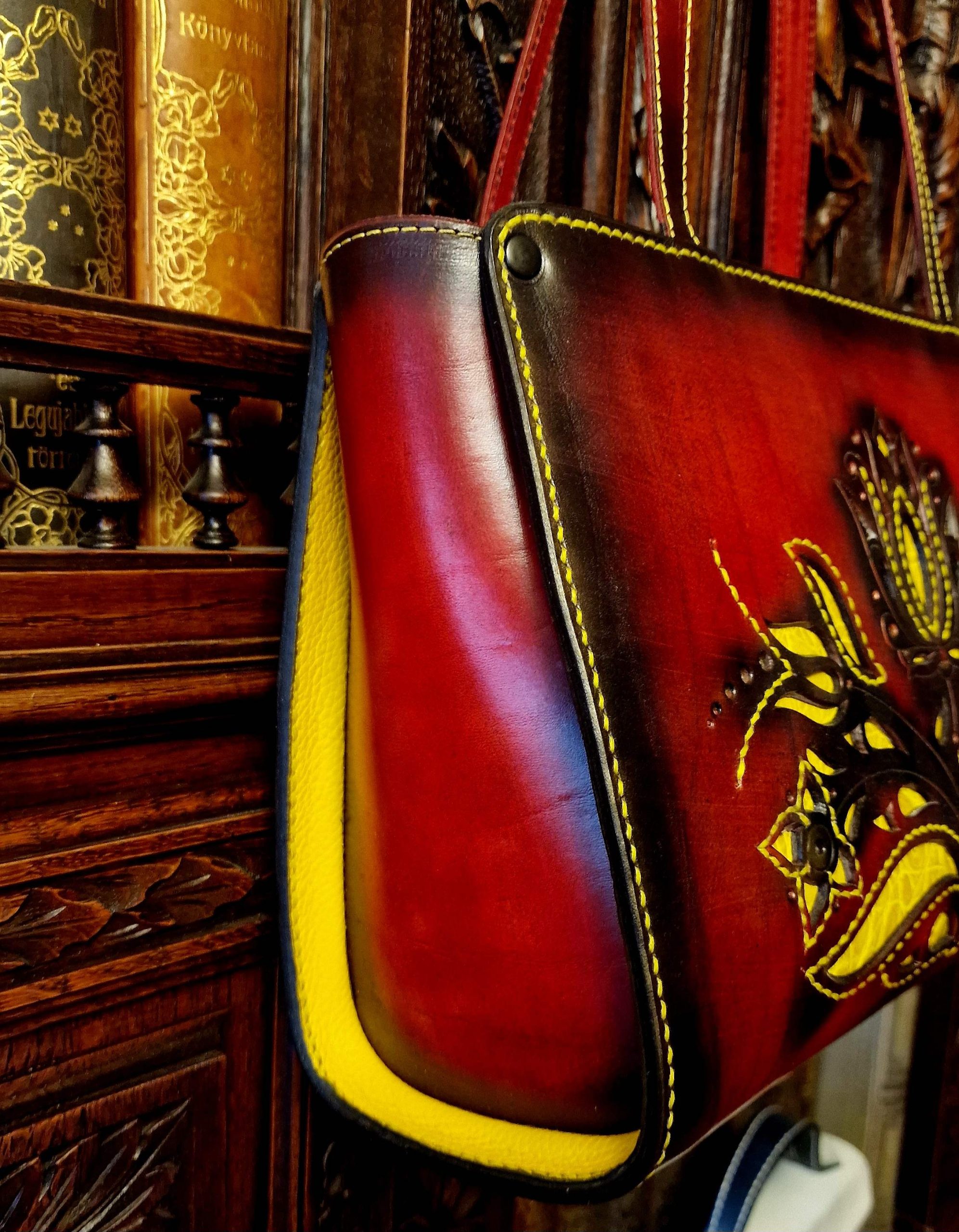 Tulipános mintával díszített, dupla kézi fogós, belső lapos zsebes, 1 rekeszes, húzózáras táska. Minden alkatrész marhabőrrel bélelt és marhabőrből teljesen kézzel készített.