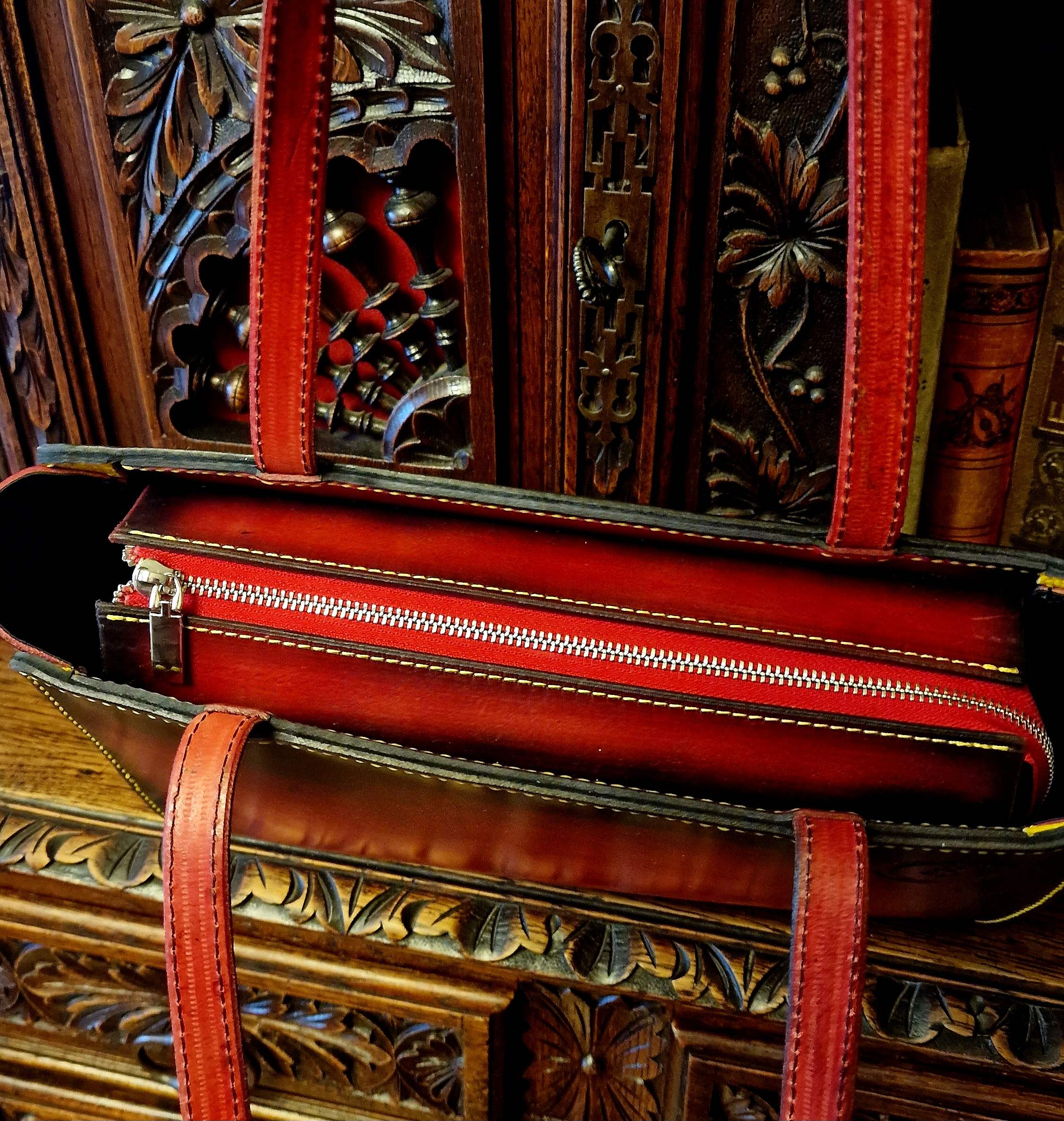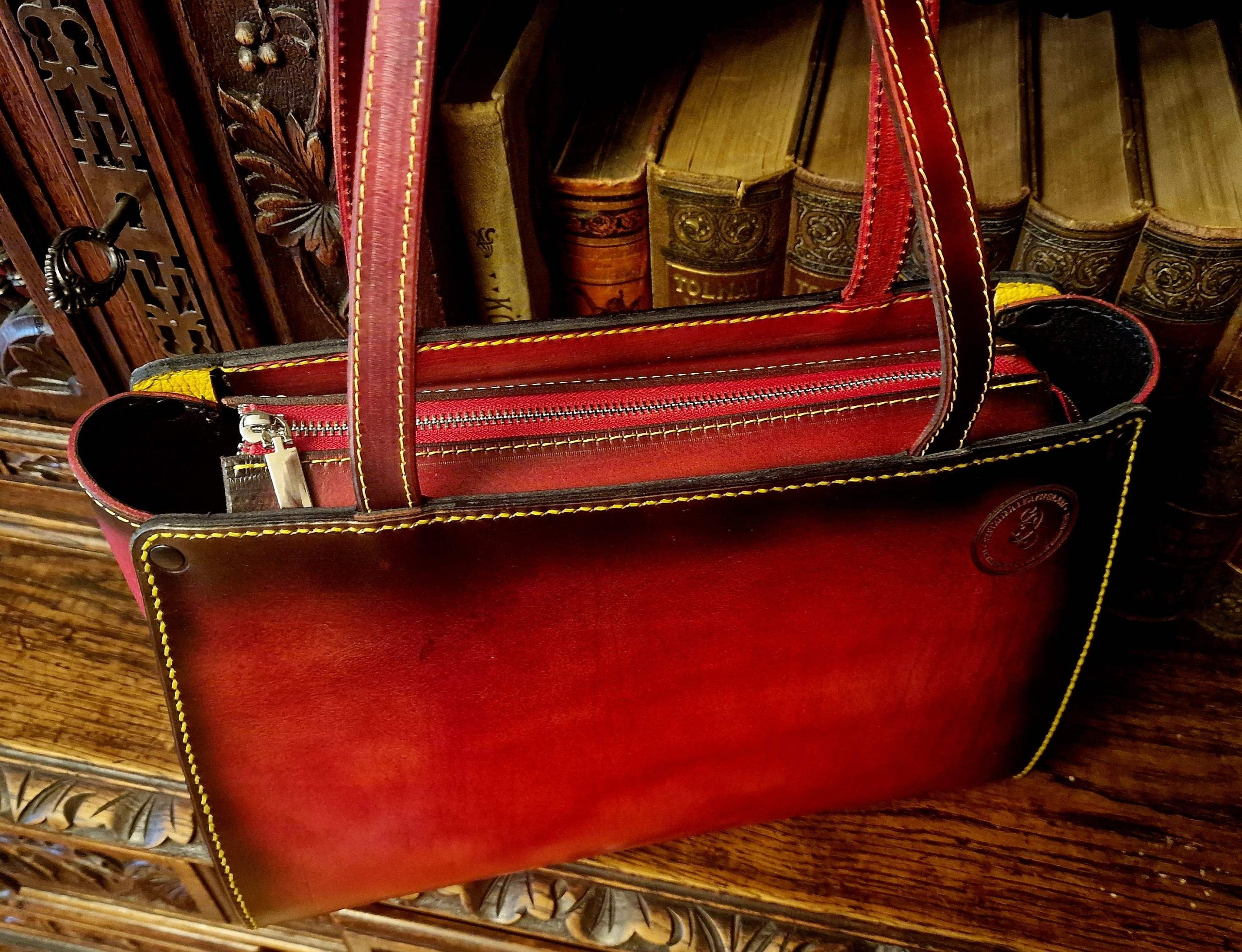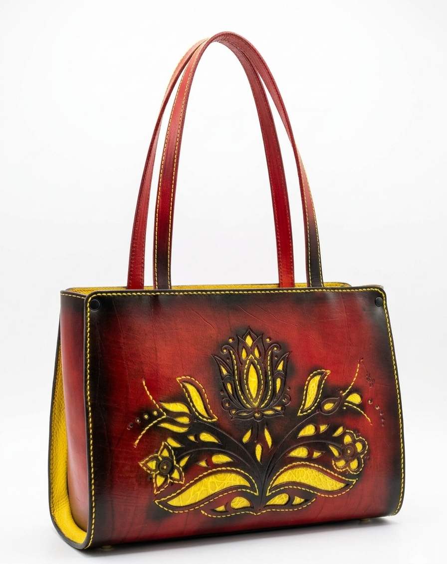 Tulipános mintával díszített, dupla kézi fogós, belső lapos zsebes, 1 rekeszes, húzózáras táska. Minden alkatrész marhabőrrel bélelt és marhabőrből teljesen kézzel készített.