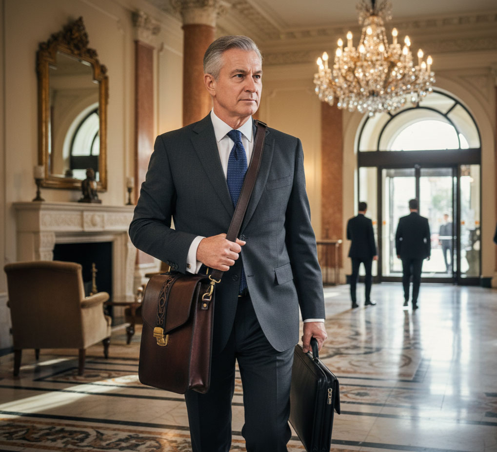 | Kialakítás | bőr béléses, 2 rekeszes, 1 belső lapos zseb, 1 külső lapos zseb, 1 kézi fogó, rövid fogó, fedeles, állítható vállpánt, levehető vállpánt |